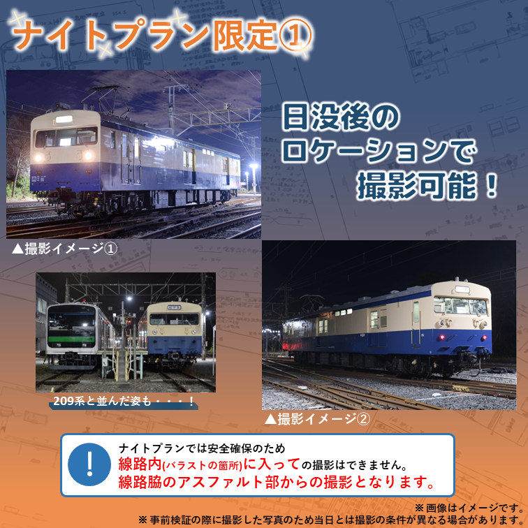 レンタル品について | 撮影会参加時に着用いただくヘルメット・チョッキ等の保護具を貸出しいたします。(無料) |